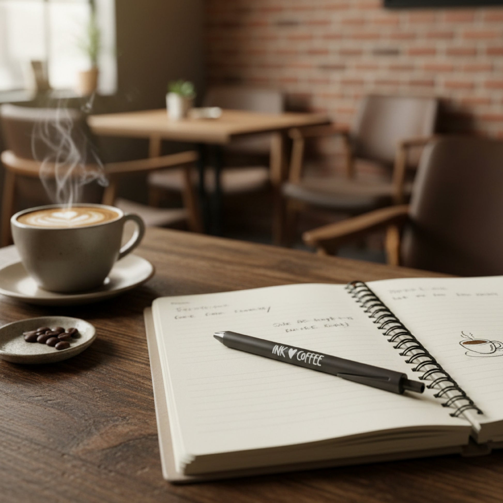 Der Druck Ink ♡ Coffee spricht für sich. Für Notizen beim ersten Kaffee am Morgen. Für Ideen zwischen zwei Schlucken. Für kleine kreative Momente im Alltag. Ob auf dem Schreibtisch, im Café oder unterwegs – dieser Kaffeestift aus Kaffeesatz passt einfach immer.