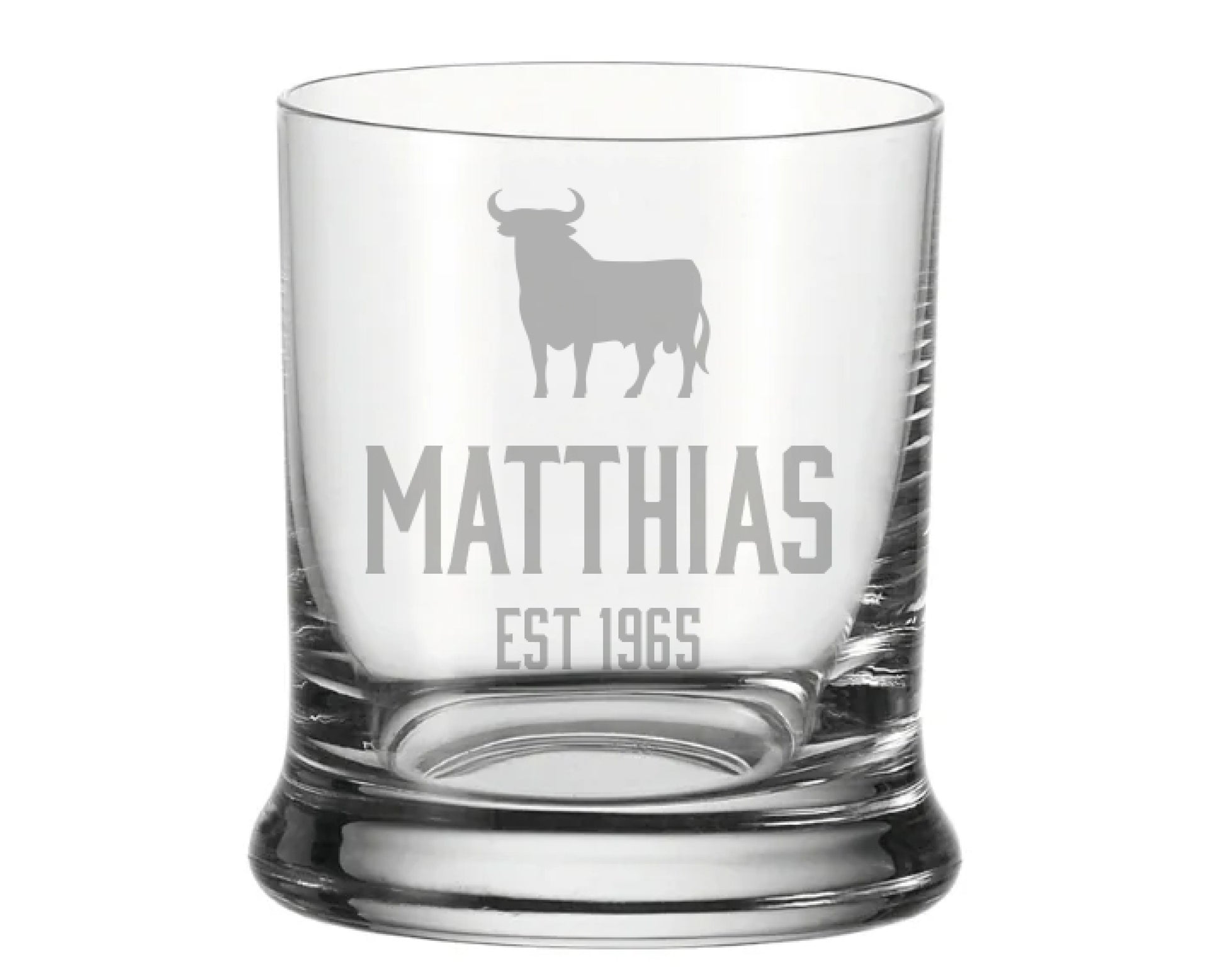 Whiskyglas Veterano Style mit Stier – personalisiert mit Name & Geburtsjahr